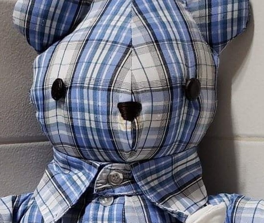 She took apart the bright blue plaid shirt. She carefully ripped out the thread and started to piece together something new: a memory bear. The teddy bear was complete with black buttons for eyes and a handkerchief in one of the pockets. Megan was touched.